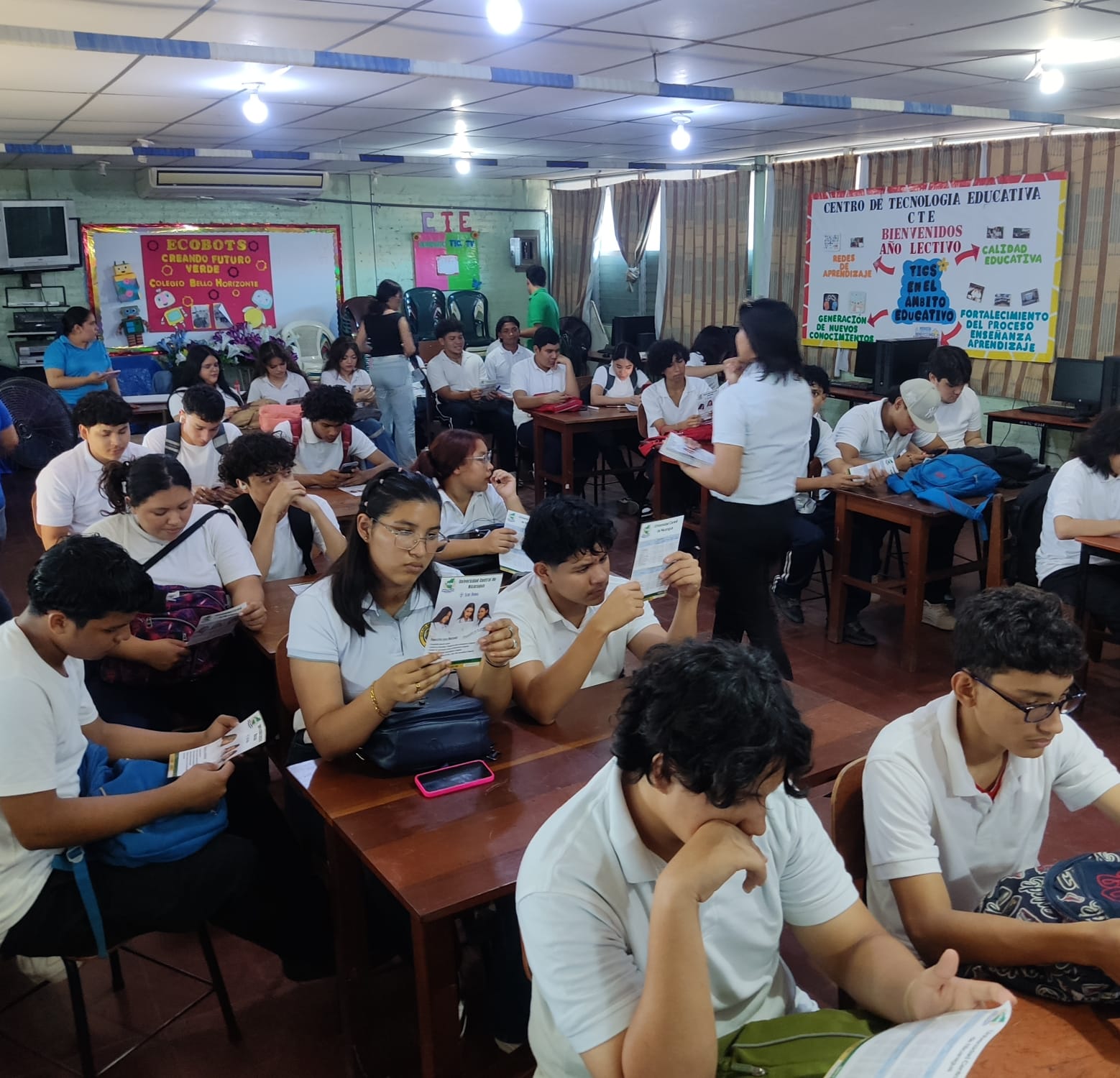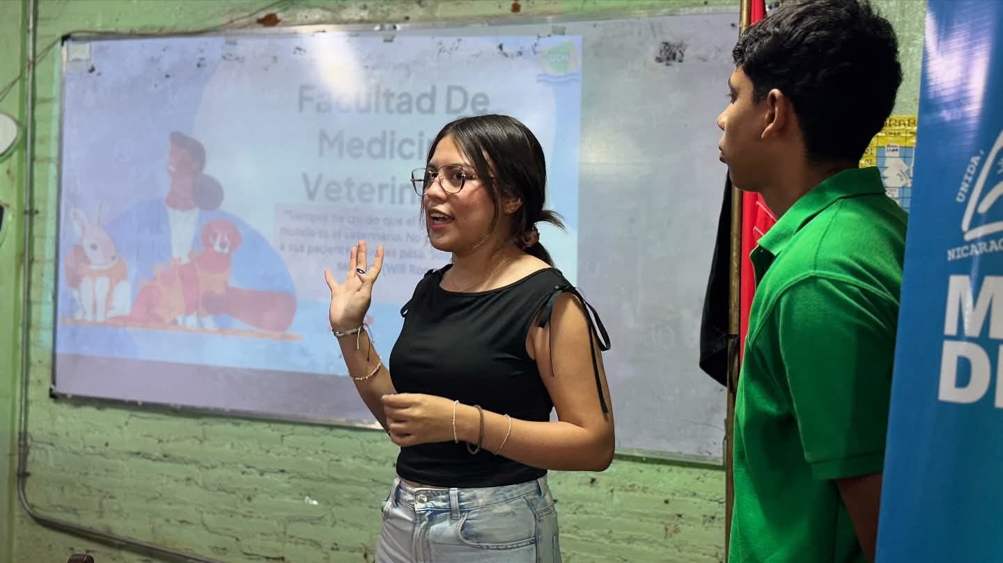 La Universidad Central de Nicaragua (UCN), sede Doral, en coordinación con el Ministerio de la Juventud (MINJUVE), llevó a cabo la charla “Jóvenes por la Educación: Descubriendo Mi Futuro” el 20 de noviembre de 2025 en el Colegio Público “Bello Horizonte”. La actividad reunió a estudiantes de secundaria próximos a culminar su bachillerato, con el propósito de fortalecer su proceso de orientación vocacional mediante el acompañamiento de jóvenes universitarios de diversas carreras de la UCN. Este espacio de intercambio permitió reflexionar sobre intereses, talentos y metas personales y profesionales, aportando al Eje 1 Educación para la Vida y al Lineamiento 1 de la Estrategia Nacional, orientado al desarrollo de la vocación y proyecto de vida de la juventud nicaragüense.